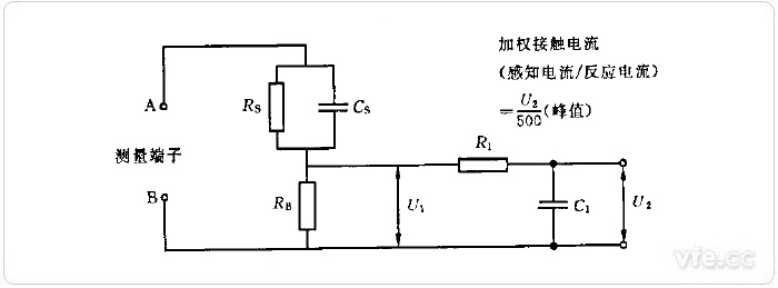 圖1示:加權(quán)接觸電流(感知電流或反應(yīng)電流)測量網(wǎng)絡(luò)