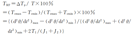 成正比。只要測(cè)量出系統(tǒng)的角加速度,就可以測(cè)出電動(dòng)機(jī)轉(zhuǎn)矩波動(dòng)值。測(cè)量角速度的問(wèn)題則可以轉(zhuǎn)換成測(cè)量系統(tǒng)角位移的問(wèn)題。也就是說(shuō),只要測(cè)量出系統(tǒng)在旋轉(zhuǎn)時(shí)的角位移就可以通過(guò)計(jì)算求出電動(dòng)機(jī)轉(zhuǎn)矩波動(dòng)值,進(jìn)而計(jì)算出轉(zhuǎn)矩波動(dòng)系數(shù)。由式2可得: